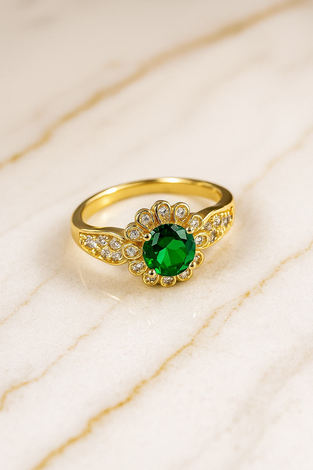 Emerald Bloom | Gold-Plated Ring with Green Stone & CZ Petals