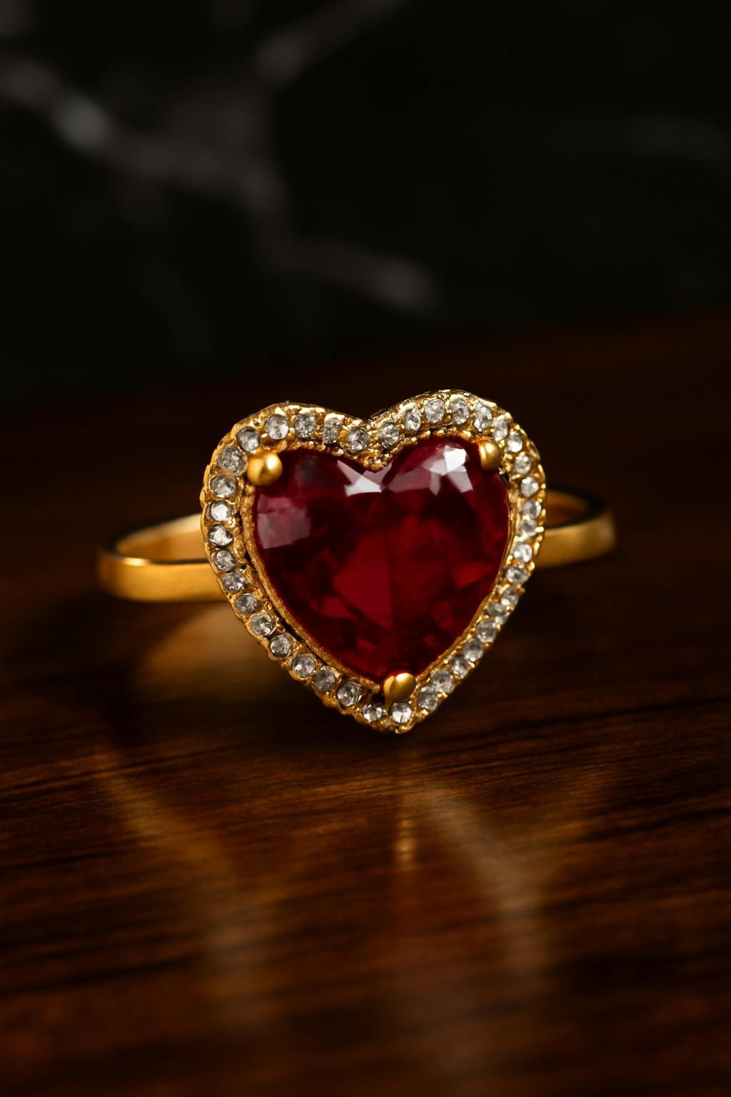 Elevate your elegance with this exquisite Heart-Shaped Ruby Gold Ring, a perfect blend of romance and luxury. Crafted with a stunning deep red ruby at the center, surrounded by a delicate halo of sparkling diamonds, this ring is set in radiant 18k gold. The bold heart-shaped gemstone symbolizes love, while the diamond accents add a touch of brilliance to every glance. Ideal for special occasions like engagements or anniversaries, or as a timeless addition to your jewelry collection. This piece embodies sophistication and style, making it the perfect gift for someone you love or a well-deserved treat for yourself.