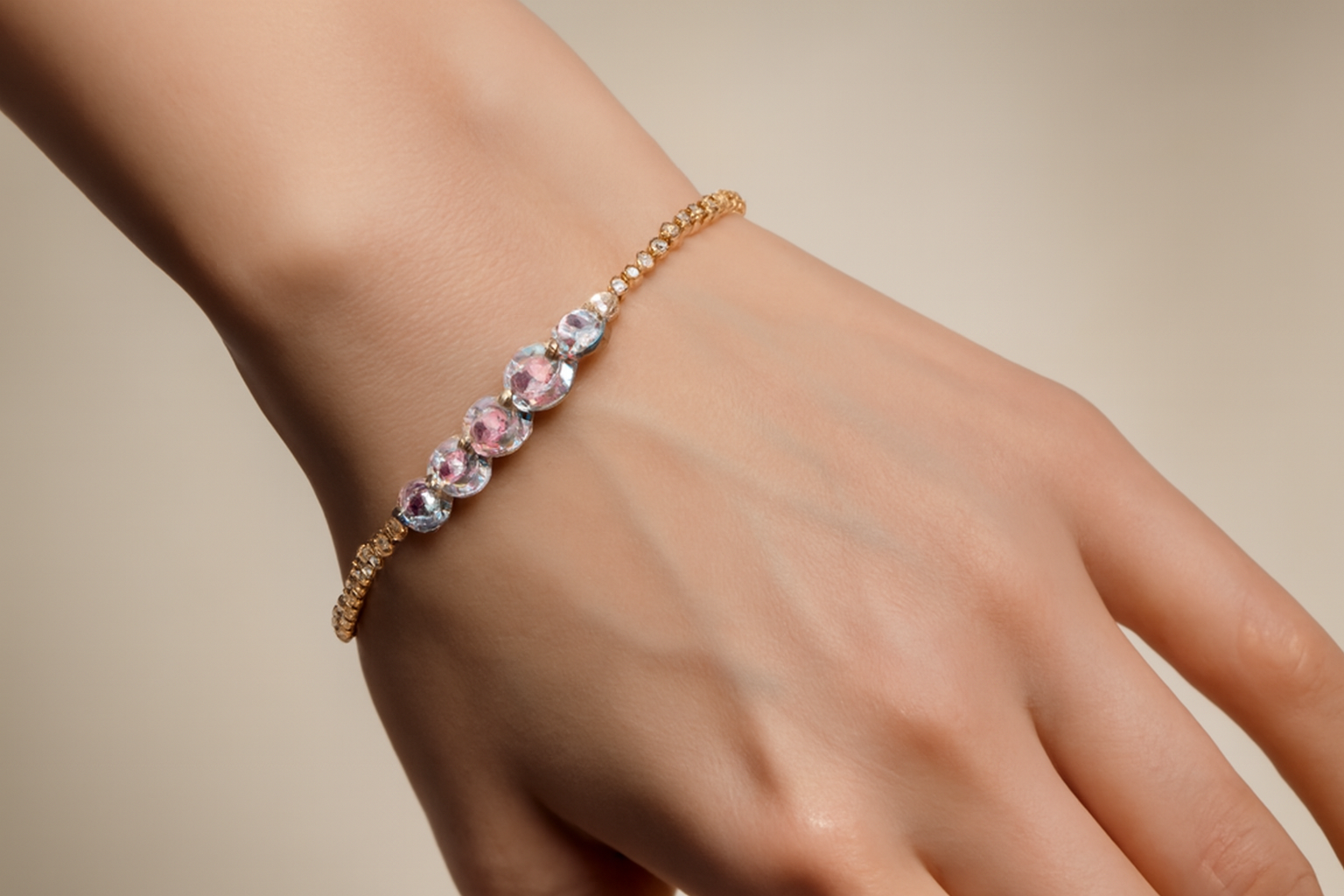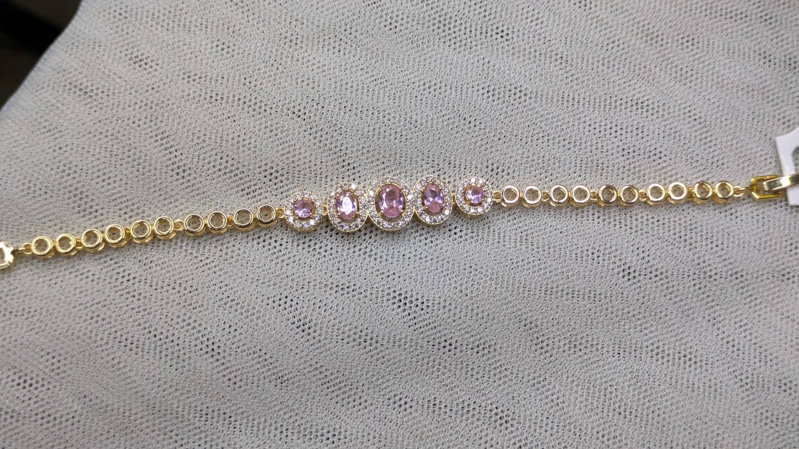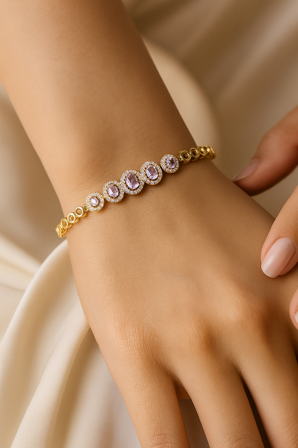 Elevate your style with the exquisite Lavender Luxe Gold Bracelet. This stunning piece features five oval-shaped lavender gemstones, each encircled by a delicate halo of sparkling diamonds. Crafted in high-quality gold, the bracelet's design seamlessly combines elegance with sophistication. Perfect for adding a touch of luxury to any occasion, the Lavender Luxe Gold Bracelet is a timeless accessory that exudes charm and grace. Whether for a special gift or a personal treat, this bracelet is a must-have addition to your collection.