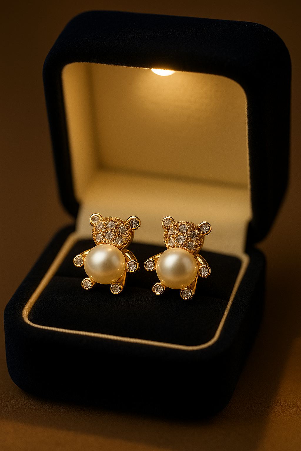 Teddy Bear Charm Drop Earrings – Cute Pearl and Diamond Design
